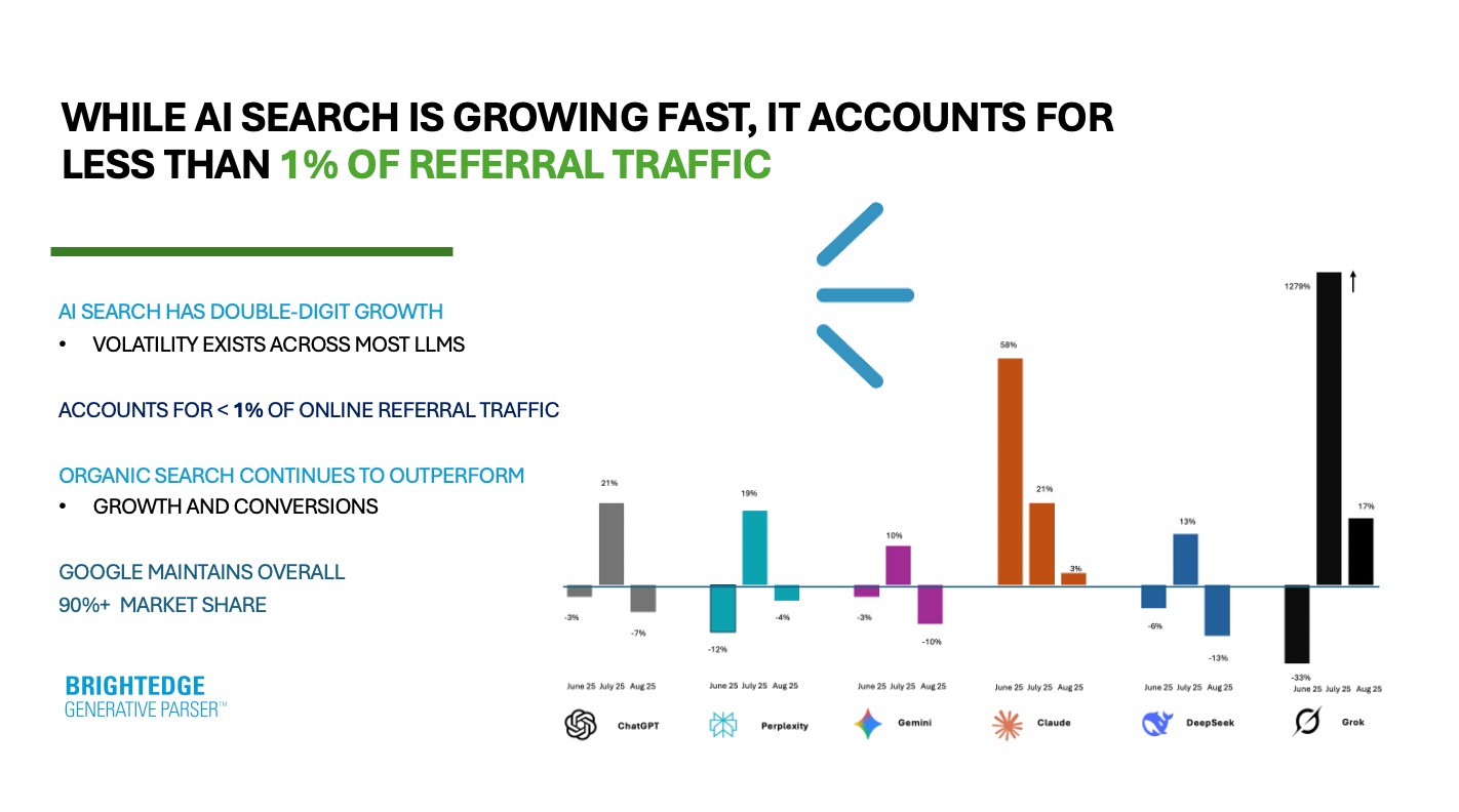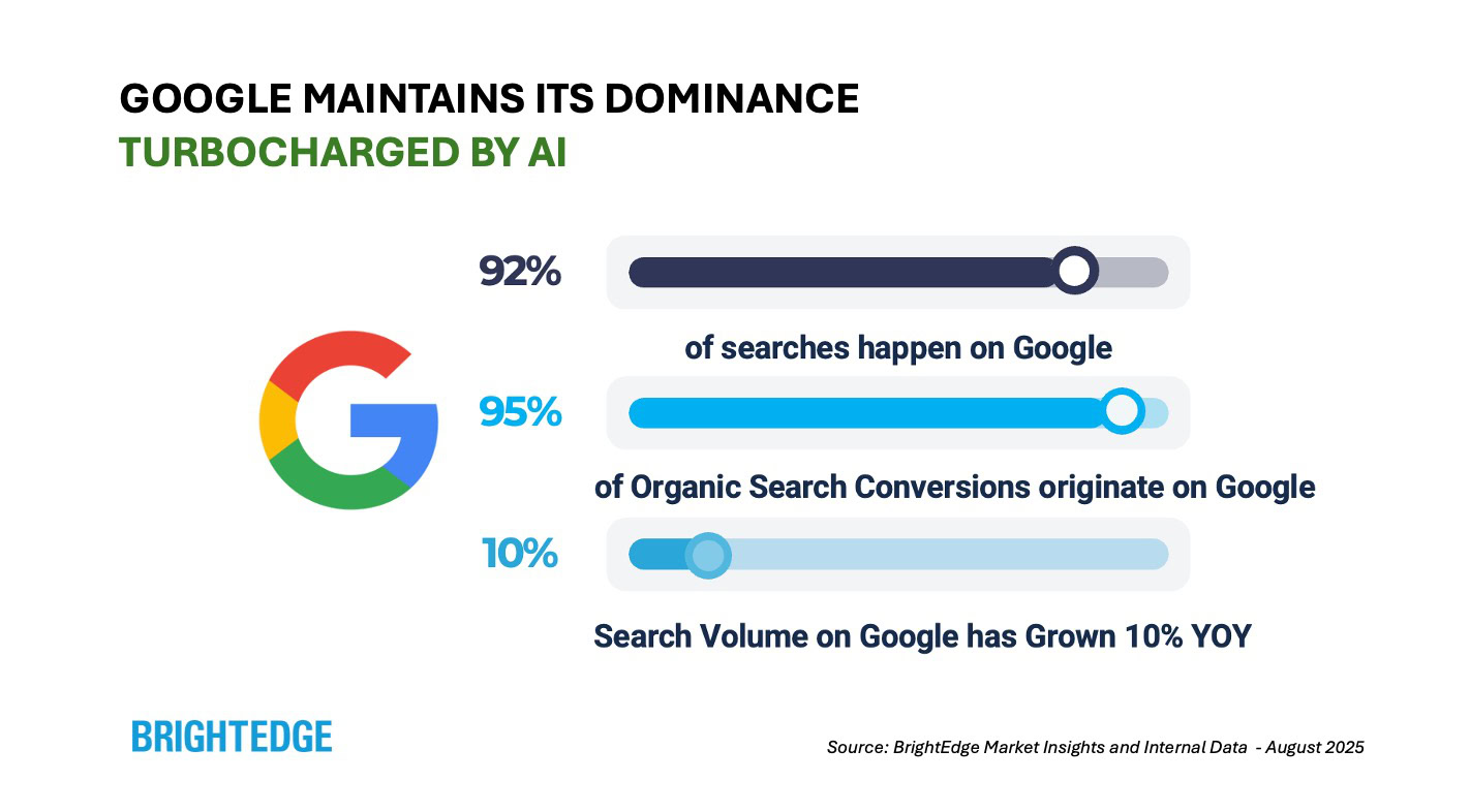 Nach unseren internen Daten treten hier 92% aller Suchanfragen auf. Und wenn es um sinnvolle Aktionen wie Downloads, Anmeldungen oder Einkäufe geht, beginnen 95% bei Google. Das Suchvolumen ist nicht gesunken-es ist tatsächlich 10% gegenüber dem Vorjahr gewachsen. Mit dem KI -Modus überlegt Google KI direkt in die Erfahrung.