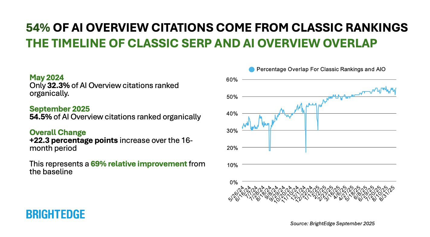 Die Überlappung zwischen KI -Zitaten und traditionellen Suchergebnissen ist seit 2024 um 22,3% gestiegen. Dies variiert jedoch erheblich von der Industrie, was Ihren vertikalen Schlüsselfaktor für die Strategieentwicklung zu einem Schlüsselfaktor macht.