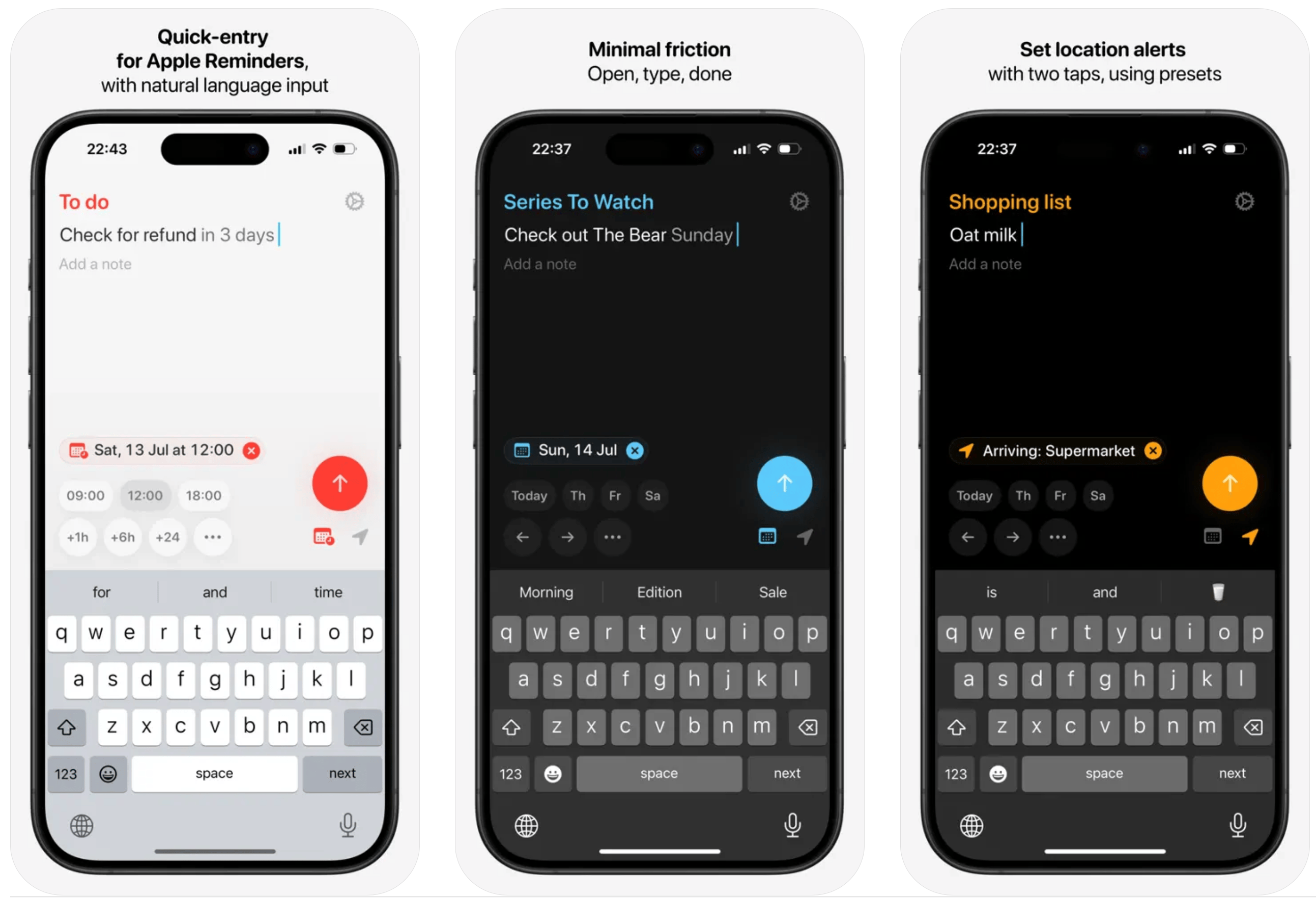 Normalerweise versuche ich, dieselbe App nicht zweimal zu erwähnen, aber da diese App so neuartig ist und wir sie seit über fünf Jahren nicht mehr erwähnt haben, dachte ich, es wäre okay, noch einmal darauf hinzuweisen. „Remind Me Faster“ hilft dabei, der Standard-App „Erinnerungen“ so schnell wie möglich einen Alarm oder ein Aufgabenlistenelement hinzuzufügen. Öffnen Sie die App und Sie können sofort mit dem Tippen beginnen – Sie müssen sich nicht durch verschiedene Listen, Tags oder Vorlagen wühlen. Geben Sie einfach Ihre Erinnerung ein, wählen Sie Datum und Uhrzeit aus, tippen Sie auf „Hinzufügen“ und schon können Sie wieder mit dem Tippen beginnen. Sie können Datumsalarme in natürlicher Sprache festlegen, z.B. „Antworte Mike morgen um 10 Uhr“, Listen durch Wischen auswählen und die App unterstützt URL-Schemata, alternative App-Symbole, Share Sheet-Erweiterungen und Sperrbildschirm-Widgets. Natürlich können Sie mit Siri schnell Erinnerungen hinzufügen, aber manchmal ist es nicht immer praktisch, laut mit einem schwerhörigen KI-Assistenten zu sprechen.