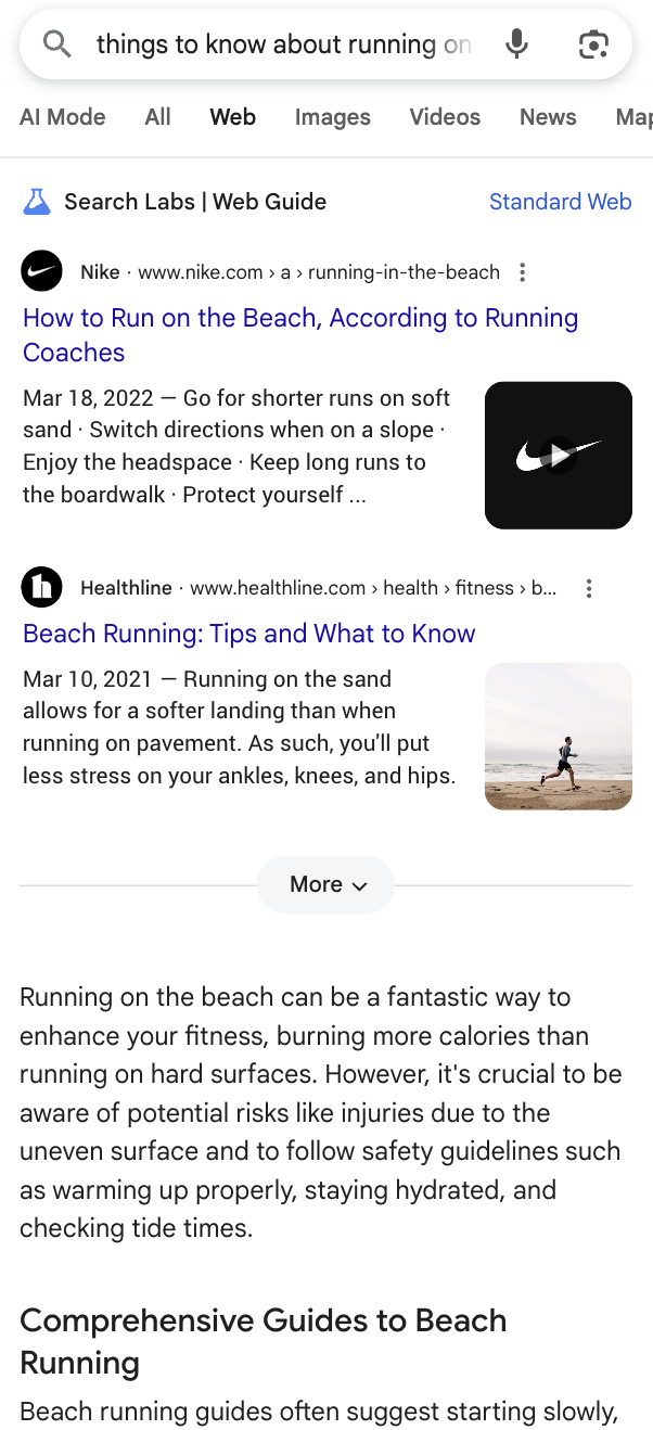 An seiner Oberfläche ist Google Web Guide eine visuelle Neugestaltung der Suchergebnisseite. Es ersetzt die traditionelle lineare Liste von „10 blauen Links“ durch ein strukturiertes Mosaik des thematischen Inhalts.