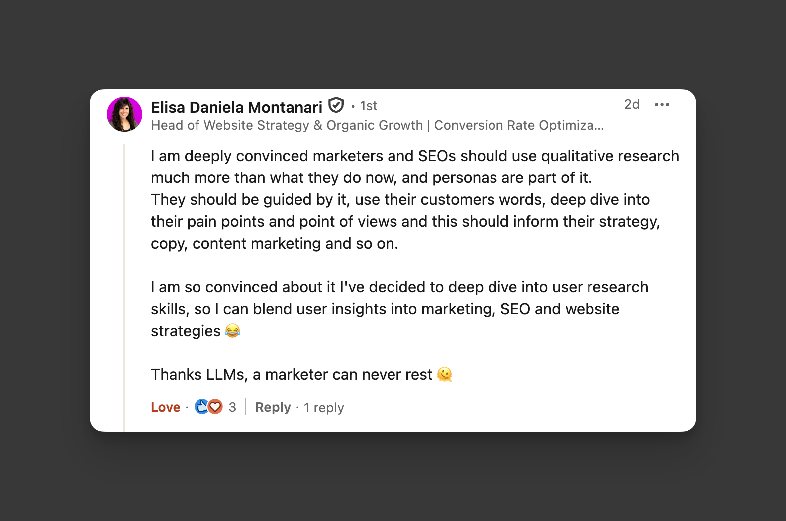 Schließlich fasst Elisa Daniela Montanari zusammen, wie viele von uns sich über die Verlagerung der qualitativen Forschung fühlen (neben der Erwähnung ihrer Ziele für Upskill als SEO, indem sie in Benutzerforschungstaktiken eintauchen):