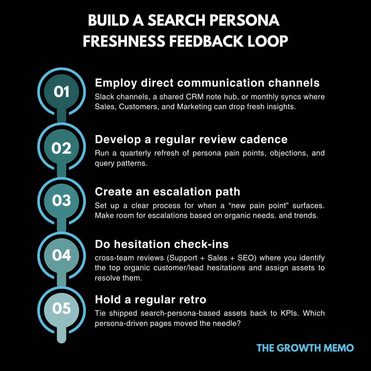 - Entwickeln Sie eine regelmäßige Bewertungs -Trittfrequenz: Führen Sie eine vierteljährliche Auffrischung von Personenschmerzpunkten, Einwänden und Abfragemustern durch. Schichten Sie in Marken -Suchtrends, Überweisungsdaten und AIO/LLM -Interaktionen zur Validierung von Aktualisierungen.