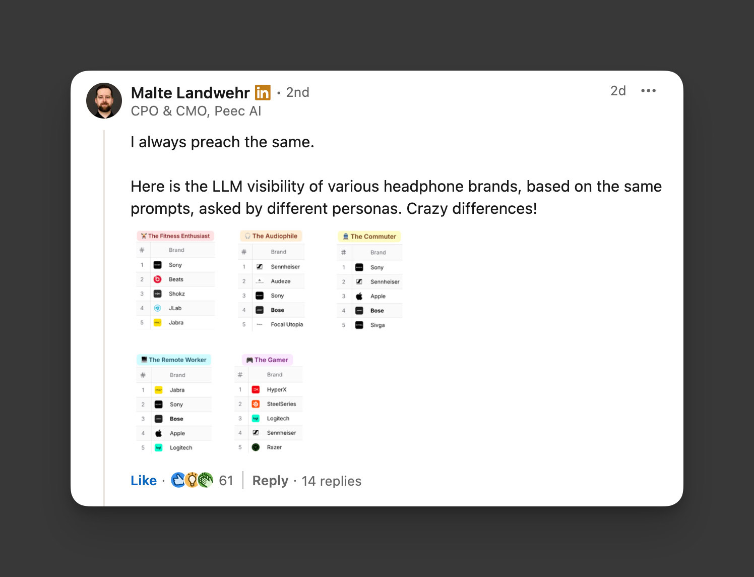 Malte Landwehr, CPO & CMO bei Peec AI, gab dieses visuelle Beispiel im Thread (mit zusätzlichem Kontext), der stark mitschwang. Aus seinen eigenen Forschungen und Tests teilte er eine visuelle Detail -LLM -Sichtbarkeit für verschiedene Kopfhörer mit, die auf Eingabeaufforderungen für Personas und Anwendungsfälle basieren.