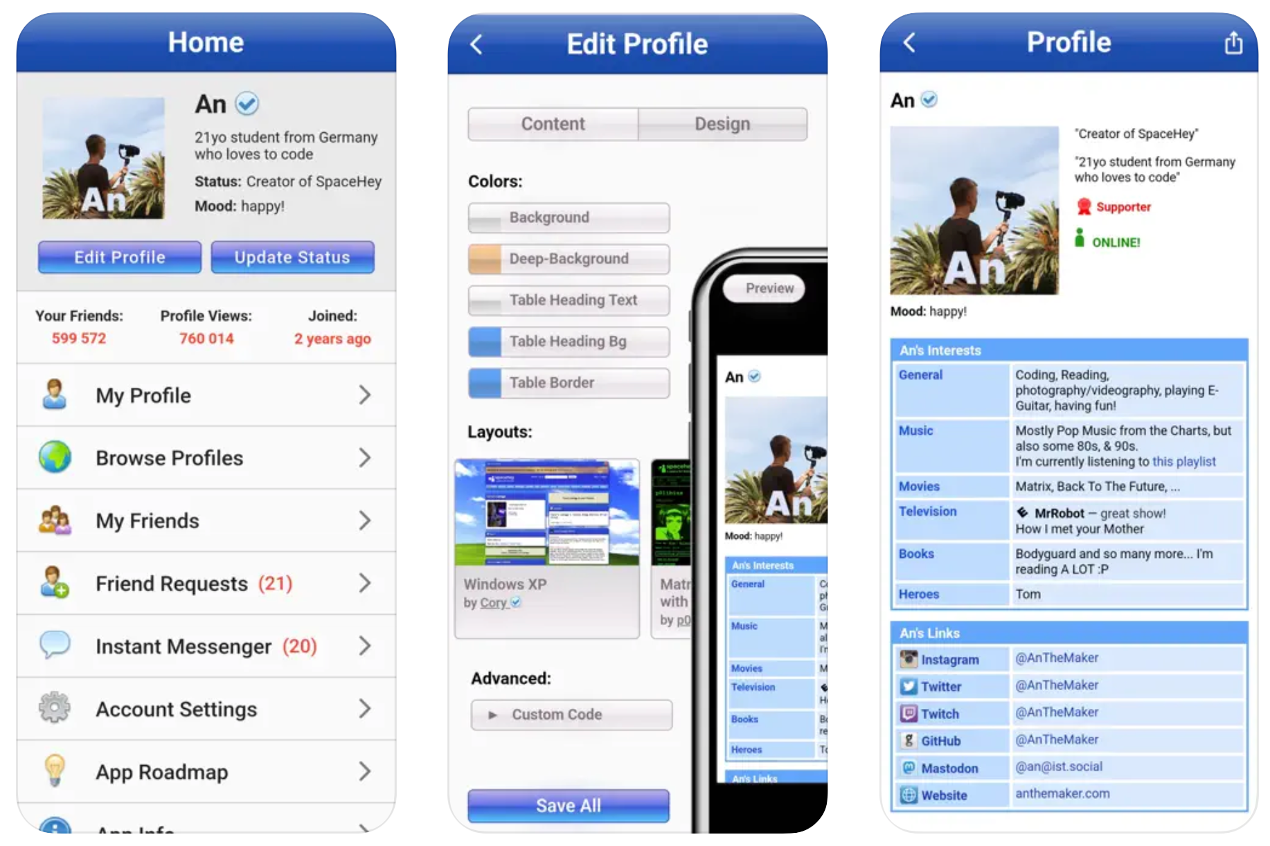 HIER ist eine App, die ich wirklich unterstützen kann. SpaceHey ist ein soziales Retro-Netzwerk mit einem Design, das an die guten alten MySpace-Tage erinnert, als soziale Netzwerke lebhaft und unterhaltsam waren und keine düsteren, deprimierenden Höllenlandschaften. Im Ernst, SpaceHey hat hier an alles gedacht, mit Bulletins, Blogs, Foren, IMs und mehr. Sie können Ihr Profil sogar mit benutzerdefinierten Layouts mit HTML- und CSS-Code anpassen – MIDI-Dateien und 8-Bit-Grafiken, ich komme. Es gibt keine Algorithmen, kein Tracking und keine personalisierten Anzeigen und Ihre Feeds sind in chronologischer Reihenfolge, frei von vorgeschlagenen Inhalten. Ich weiß, dass es heutzutage fast unmöglich ist, dass sich solche Dinge durchsetzen, aber das Team sagt, dass es bald eine Million Nutzer erreicht. Cool!