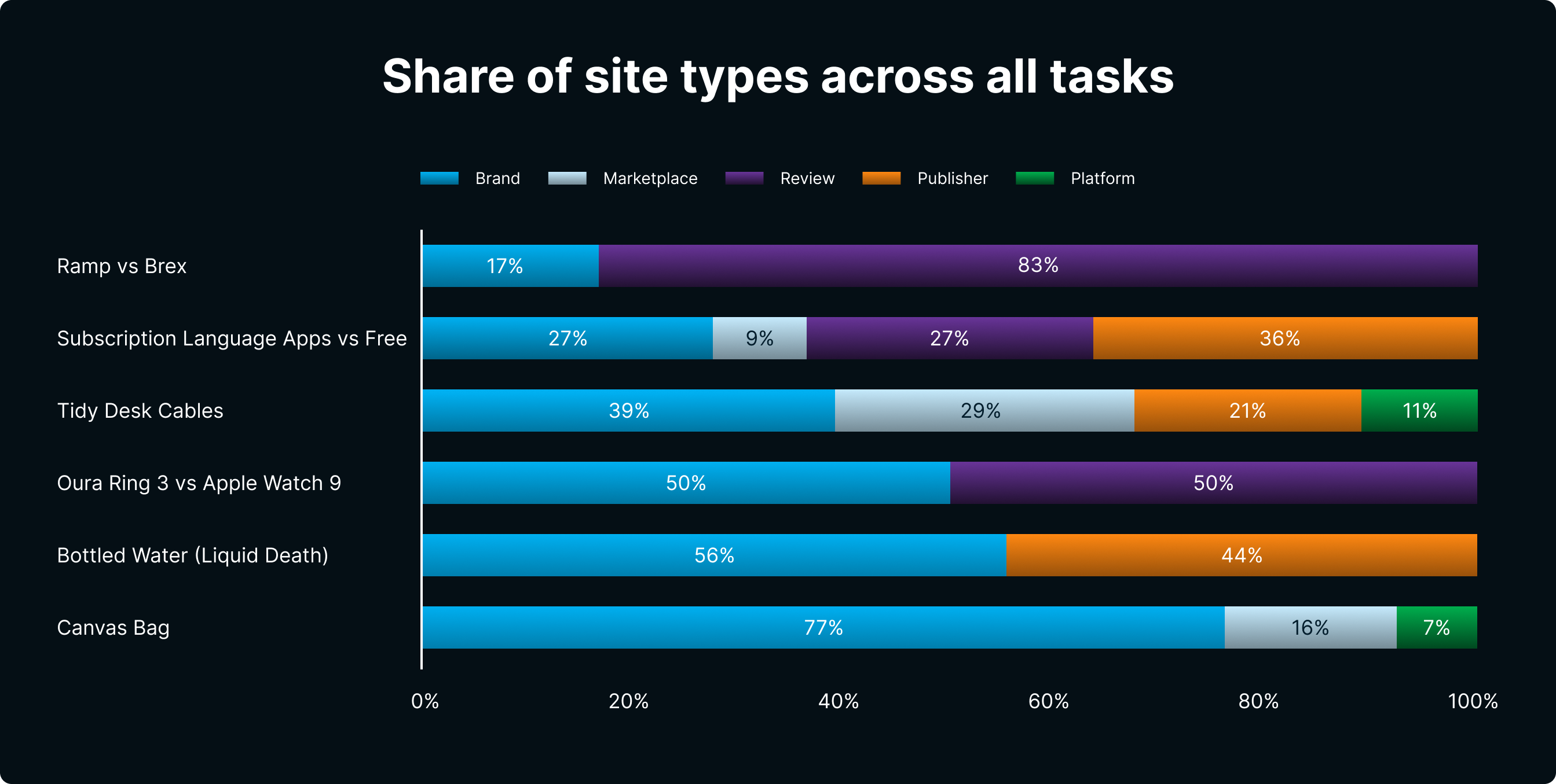 Bei Vergleichsaufgaben haben wir festgestellt, dass Überprüfungsstandorte dominieren. Für Reputationsprüfungen (wie eine Eingabeaufforderung für [Liquid Death]), Ausgänge an Marken und Verlage wurden geteilt.